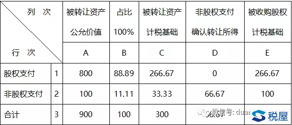 哪一种意见是正确的呢?笔者假想被转让资产的计税基础为两部分,分别对应股权支付和非股权支付,给到了一张分析表如下: